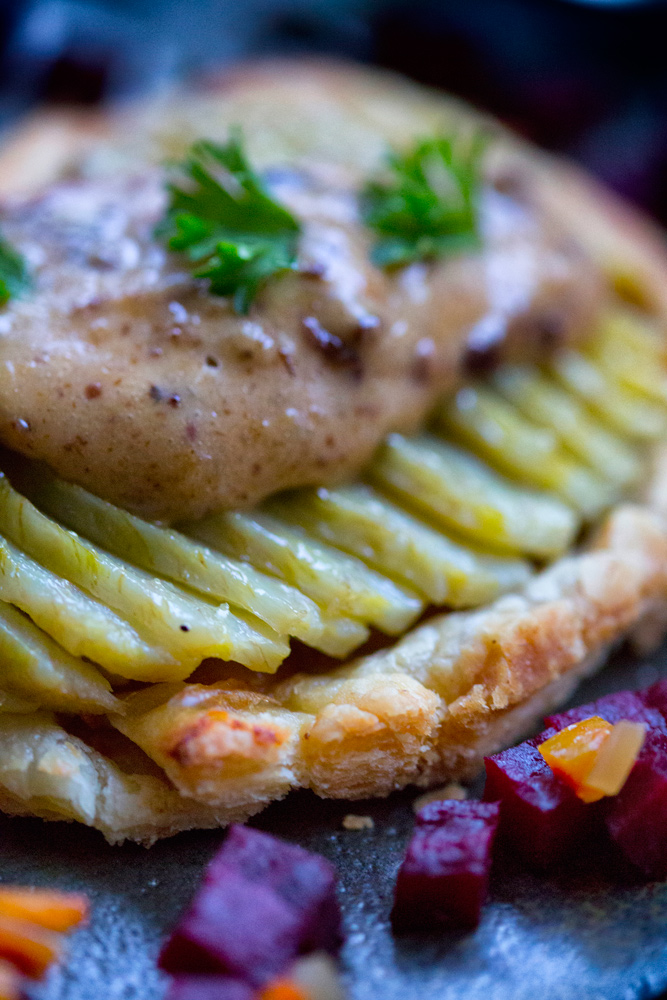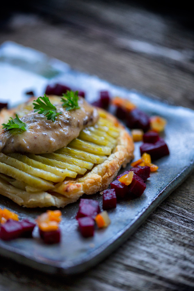 This has been a staple lunch item or appetiser on menus of mine for the past 12 years. Growing up I learned to cook at my mother’s apron strings. She made a lot of Tarte Tatins over the course of my childhood. When I became Chef of a Southern French restaurant in Chicago I decided to honour her and her provincial roots with a savoury interpretation using the classic flavours of artichokes, fennel, goats cheese and olives.