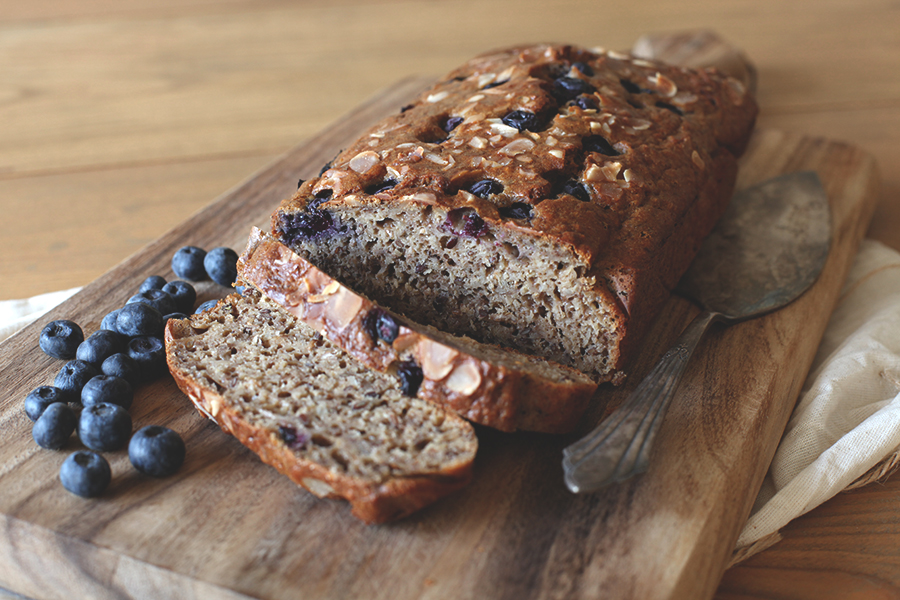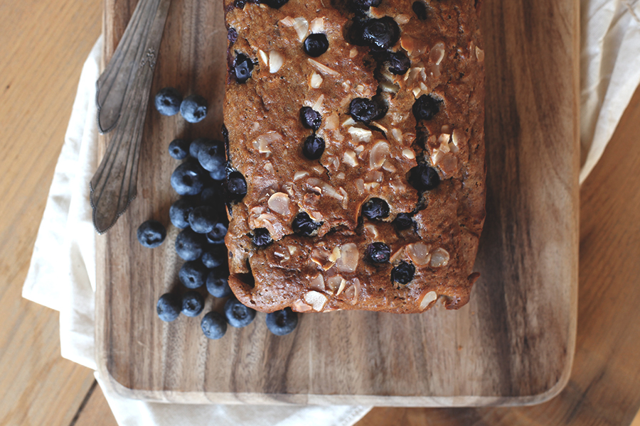 Pour the batter into a non stick loaf pan and put blueberries on top with slivered almonds.