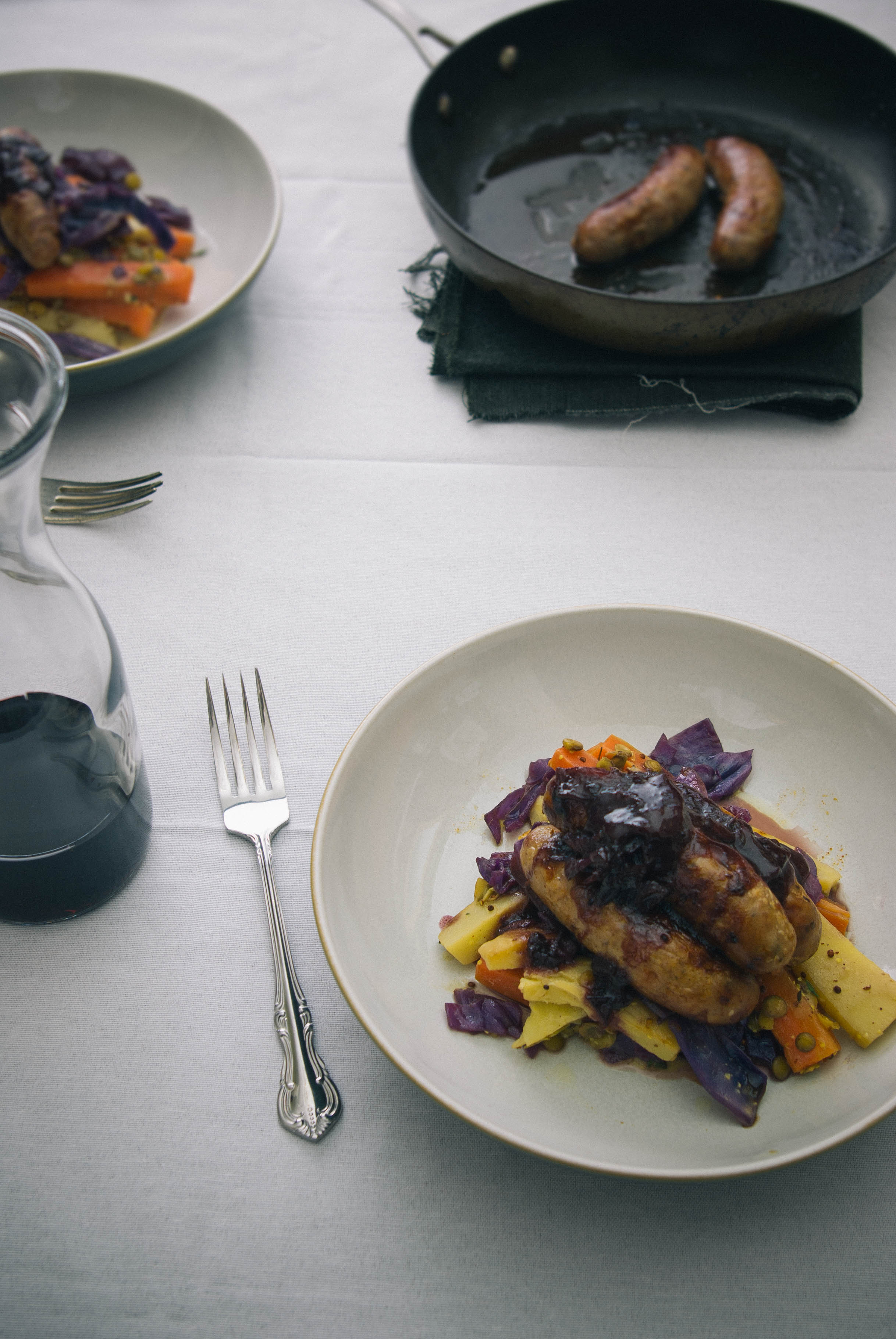 To serve, simply stack the whole thing high: sauce atop sausages atop cabbage atop roots and lentils, and enjoy.